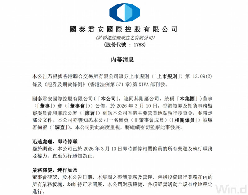 对于此前有报道称“国泰君安国际、中信证券香港办公室被上门搜查”一事,3月12日盘前,国泰君安国际(1788.HK)发布公告证实,3月10日,香港证监会和廉政公署到访公司香港主要营业地点执行搜查令,并带走部分文件。